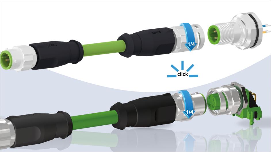 Im Vergleich zum klassischen Schraub-Steckverbinder benötigt der Monteur für die CONEC M12 Serie mit Bajonett Schnellverriegelung keinen Drehmomentschlüssel, es ist kein Sichtkontakt nötig, um sicher zu verriegeln. Eine Vierteldrehung mit der Hand reicht völlig aus, um eine vollständige Kontaktierung herzustellen.