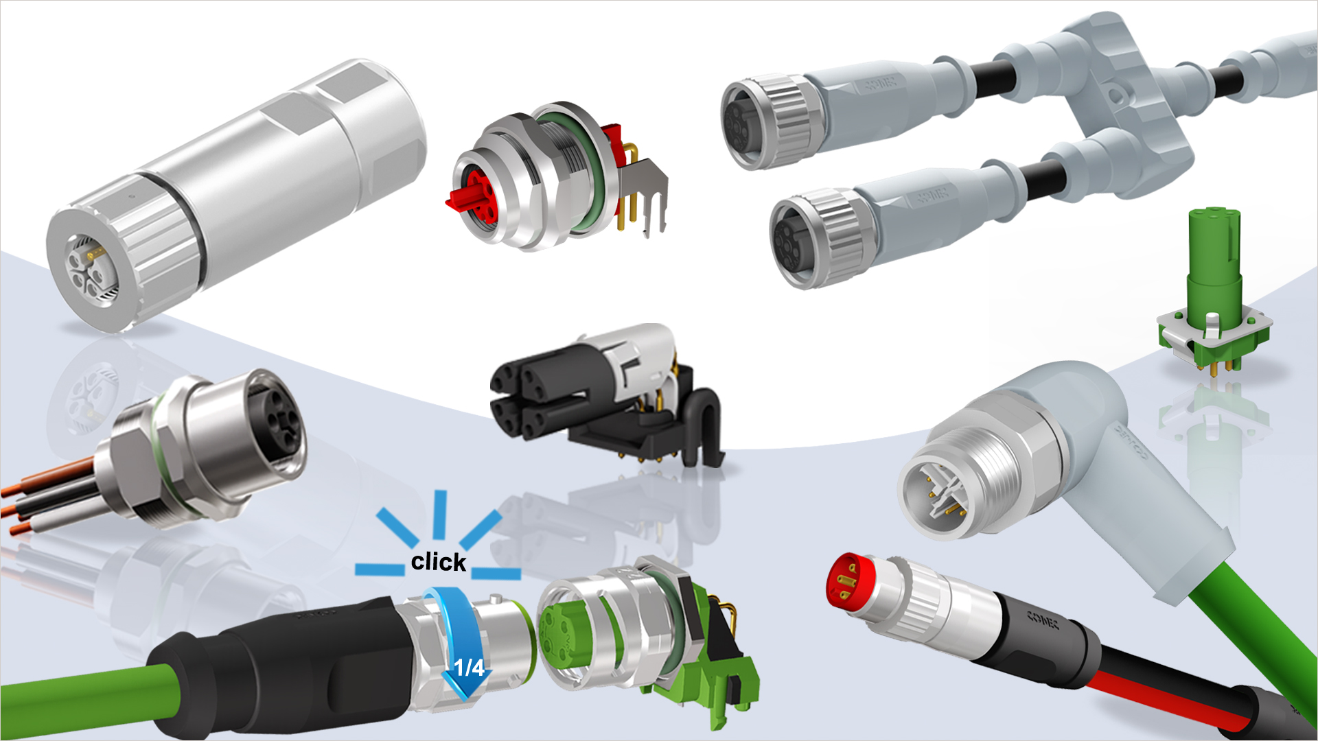 Steckverbinder mit Bajonett Schnellverriegelung stehen in den Varianten umspritzt, konfektionierbar und als Flansch zu Verfügung. Die Bajonettflansche sind mit einem Innengewinde im Steckbereich ausgestattet und gewährleisten somit eine 100 %tige Rückwärtskompatibilität mit Standard-M12 Schraubsteckverbindern.